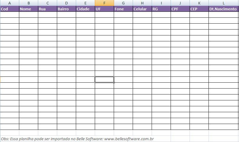 A forma mais fácil de criar este cadastro é através de uma planilha. Um modelo básico é suficiente para iniciar. Observe a figura em destaque.